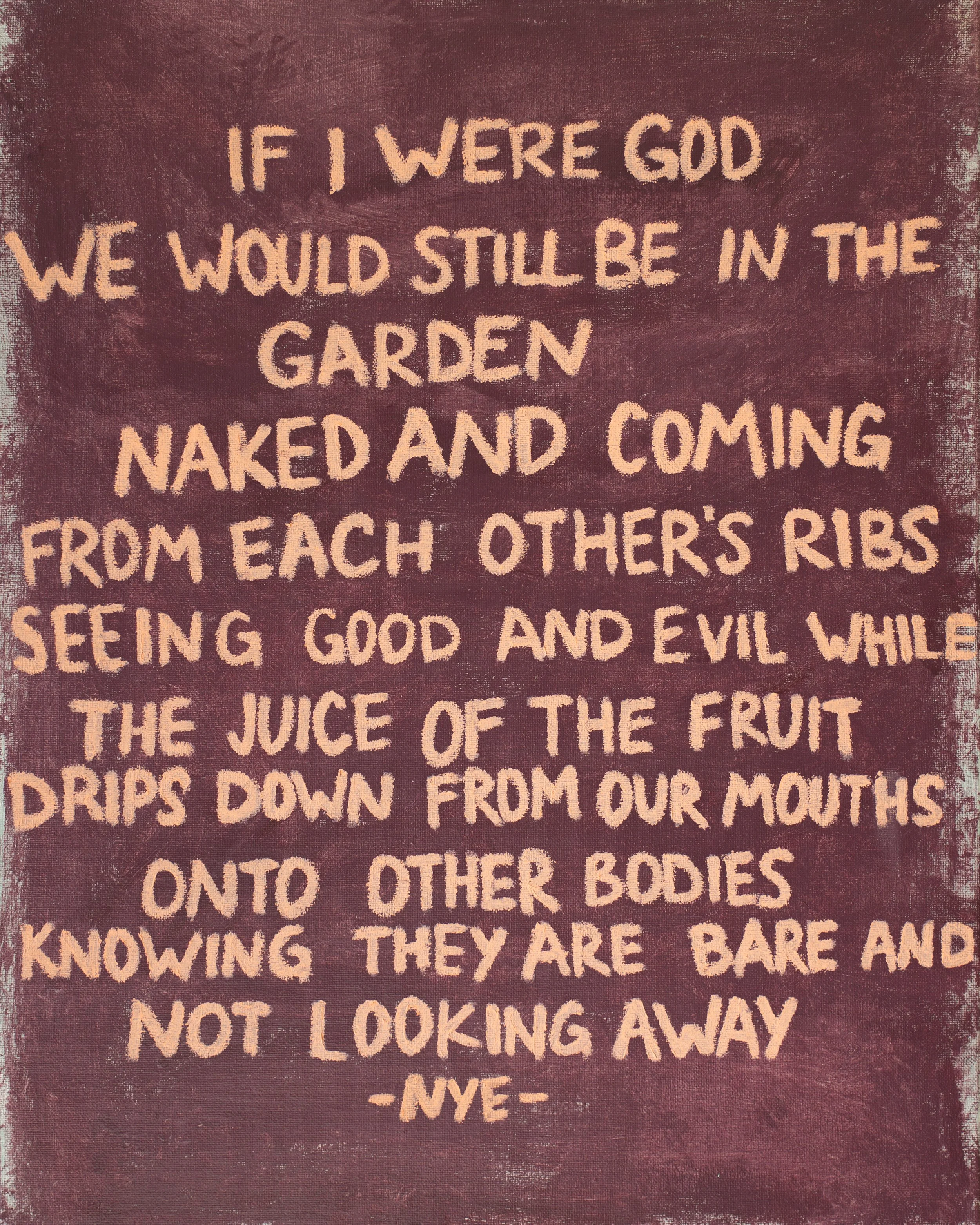 Nye marries their poetry and visual art through their work. Writing through a meditative lens they speak on spirituality, queerness, chronic illness, as well as the love and healing that can come through your friends and community.